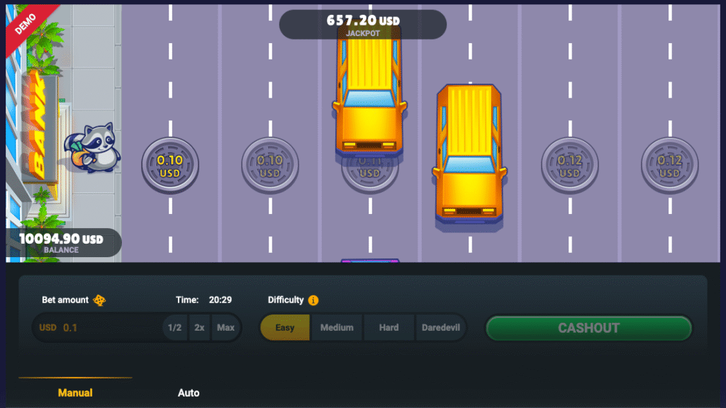 Once you’ve configured your bet and difficulty, click “Start Game” to begin your escape attempt. The raccoon appears at the bottom of the screen, ready to dash across the busy highway. Each lane crossing increases your multiplier, but vehicles can appear at any moment.